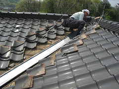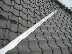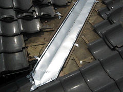 大津市O様邸 雨漏りがするとの点検依頼があり早速伺いますと階段の壁に雨漏りの痕跡がありました。 屋根に上がって点検すると・・・ 銅製の谷板が酸性雨により溶かされ穴があいていました 穴があいてなくても変色している箇所は予備軍です 谷板の取替えを提案し工事をおこないました 必要な瓦をめくって・・・ ステンレス製の谷板に取り替える事にしました 取替えました 瓦を治めて完成
